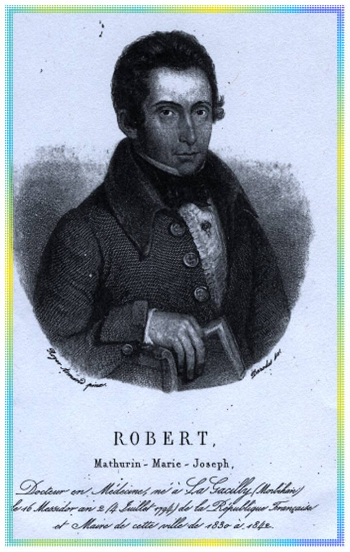 Mathurin Robert n’avait donc que onze mois au décès de son père. Après de brillantes études, il devient docteur en médecine et s’installe à La Gacilly. Il apparaît sur les registres d’état-civil comme témoin à 24 ans au mariage Ollivier/Soulaine du 28 juin 1819 puis à la naissance de Marie Thérèse Étrillard le 2 avril 1820. On lui attribue alors la profession de chirurgien.