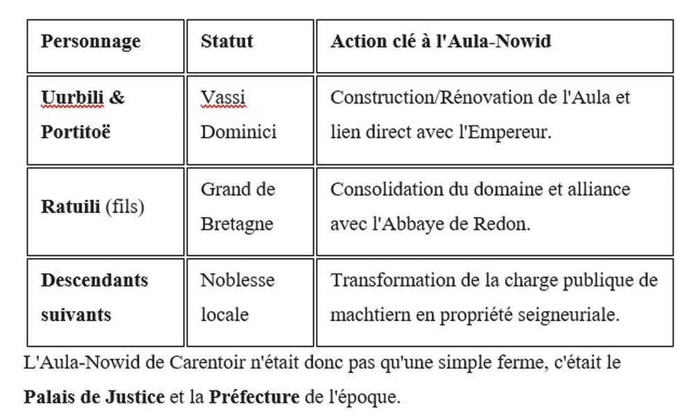 • La continuité du pouvoir : Ratuili est mentionné dans le Cartulaire de Redon comme agissant lui aussi à l'Aula-Nowid. Cela prouve que la "Cour Nouvelle" n'était pas un bâtiment temporaire, mais bien la résidence dynastique officielle de la famille.